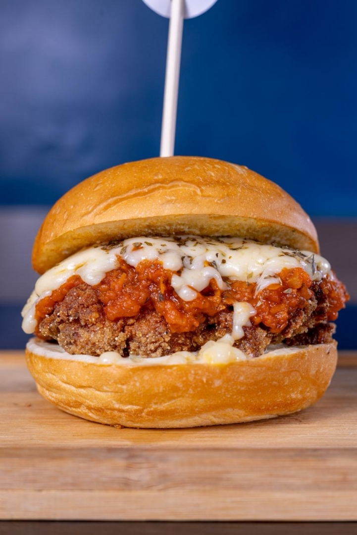 Burguer de Parmegiana de frango crocante Tortugo: Sobrecoxa de frango empanada crocante, pasta de alho Tortugo, molho de tomate rústico Tortugo e mussarela gratinada - no pão brioche