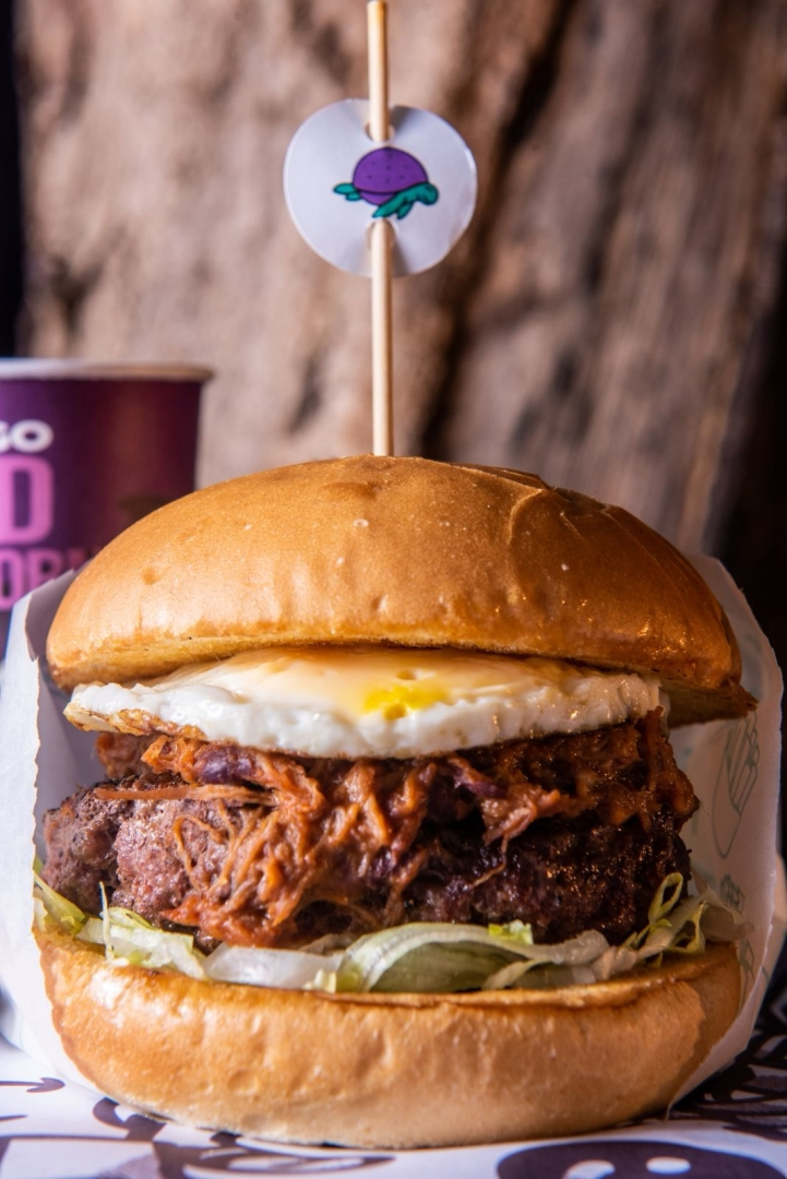 Alface, tomate, blend bovino (160g) assado na parrilla, molho chilli com carne de porco, ovo. No pão brioche