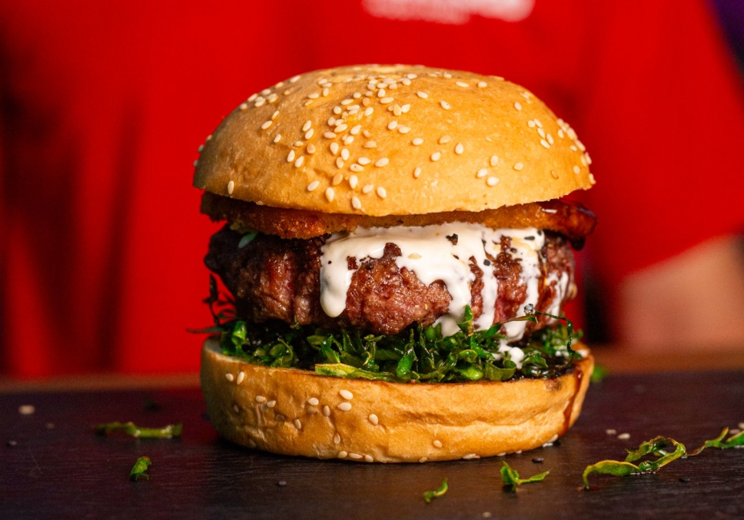 Blend bovino (160g) com mussarela empanada, Cream cheese flambado, couve crispy e molho teriaky.