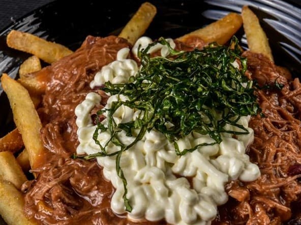 Batata frita apimentada com molho chilli de porco servida acompanha de sour cream.