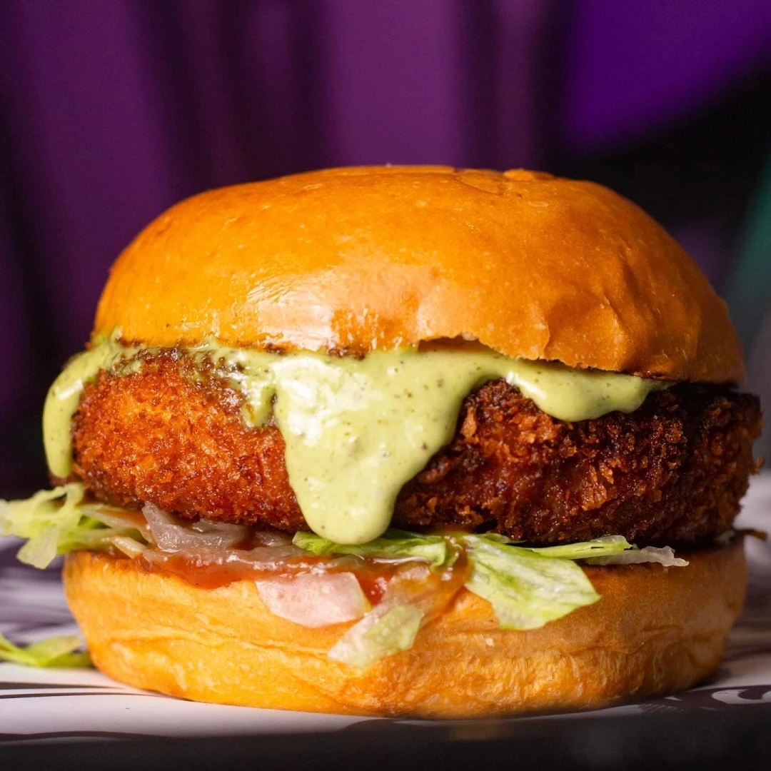 Bburguer de creme de galinha!creme de galinha empanado e frito, com alface chiminese e barbecue no pão de brioche